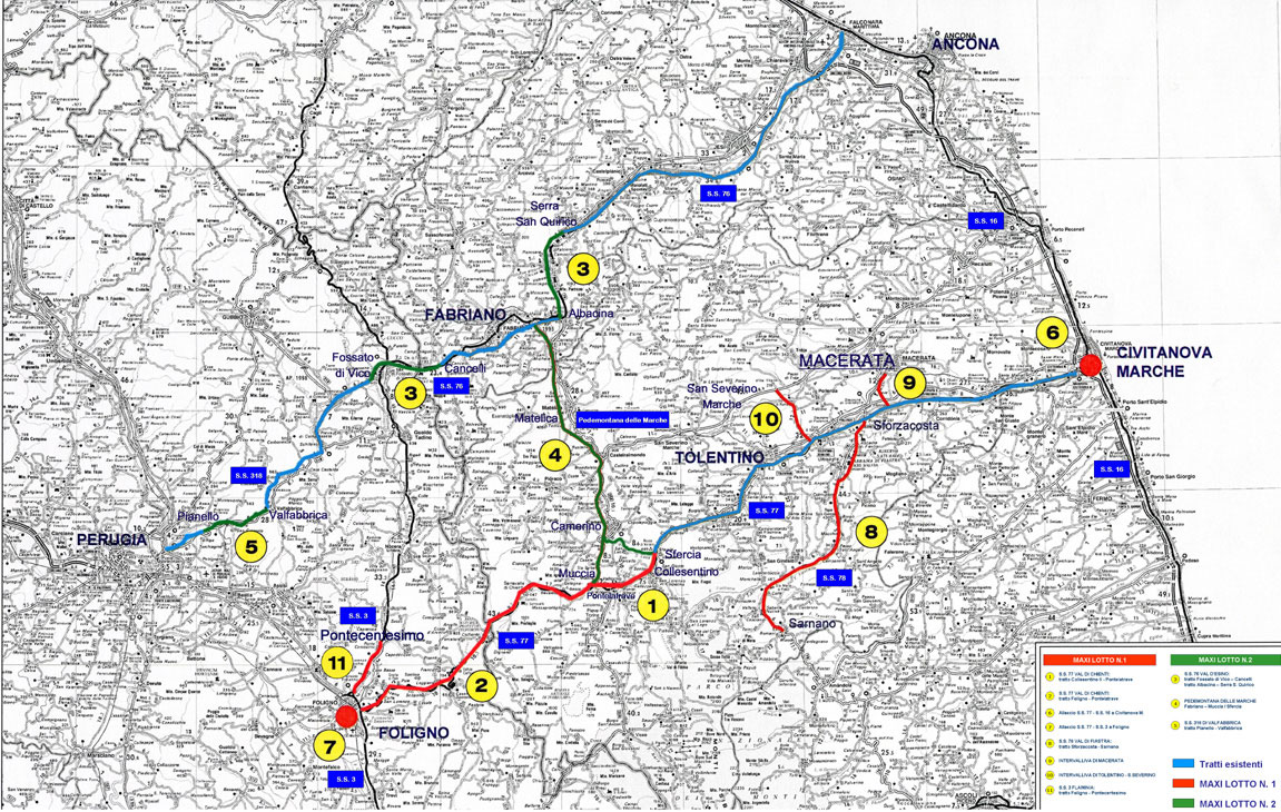 S.S. 318 DI VAL FABBRICA: tratto Pianello - Valfabbrica S.S. 3 FLAMINIA: tratto Foligno - Pontecentesimo Allaccio S.S. 77 - S.S. 3 a Foligno S.S. 77 VAL DI CHIENTI: tratto Foligno - Pontelatrave S.S. 76 VAL D'ESINO: tratto Fossato di Vico - Cancelli PEDEMONTANA DELLE MARCHE: Fabriano - Muccia / Sfercia S.S. 77 VAL DI CHIENTI: tratto Collesentino II - Pontelatrave S.S. 76 VAL D'ESINO: tratto Albacina - Serra S. Quirico S.S. 78 VAL DI FIASTRA: tratto Sforzacosta - Sarnano INTERVALLIVA DI TOLENTINO - S. SEVERINO INTERVALLIVA DI MACERATA Allaccio S.S. 77 - S.S. 16 a Civitanova M.